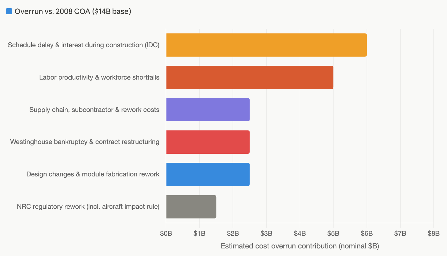 The cost factor decomposition in Figure 2 represents the author's analysis of publicly available primary sources and should not be read as an audited accounting of Vogtle Units 3 & 4 construction expenditures. Total project cost estimates at each milestone are drawn from Georgia Power's semi-annual Construction Monitoring Reports filed with the Georgia Public Service Commission (Dockets 29849 and 40339). Causal attribution across factors draws additionally on: the Westinghouse Electric Company Chapter 11 disclosure statement and settlement agreements (Bankr. S.D.N.Y. No. 17-10751, 2017–2018); NRC Confirmatory Action Letters and design change inspection reports accessed through the NRC’s ADAMS public document system; and DOE Loan Programs Office monitoring summaries for the Title XVII loan guarantee portfolio. Attribution of costs to the aircraft impact design requirement (10 CFR 50.150) relies on NRC design change notices and is presented as a component of the broader “design changes” category in Georgia Power filings; no standalone audited figure for this line item is publicly available. Interest during construction (IDC) is estimated based on reported schedule slippage against the original 2016–2017 commercial operation date targets and Southern Company’s disclosed weighted average cost of capital for rate-regulated assets. All figures are nominal USD. For comparative cost escalation methodology, see Buongiorno et al., The Future of Nuclear Energy in a Carbon-Constrained World (MIT Energy Initiative, 2018), ch. 4; and Lovering, Yip & Nordhaus, “Historical construction costs of global nuclear power reactors,” Energy Policy 91 (2016): 371–382.