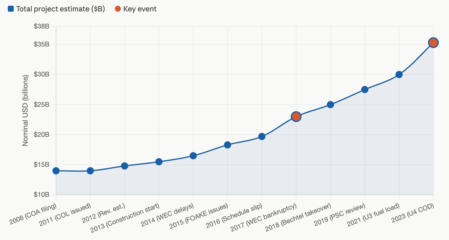 Regulatory indeterminacy was not the only culprit. Vogtle began construction with an incomplete design, an immature supply chain, and an untrained workforce. But the feedback loop between design instability and regulatory re-opening is inseparable from those other failures. Mid-construction design changes require new regulatory review. New regulatory review extends the timeline. Timeline extension compounds financing costs on a project with billions of dollars of in-process capital. Westinghouse’s bankruptcy in 2017 was the downstream consequence.